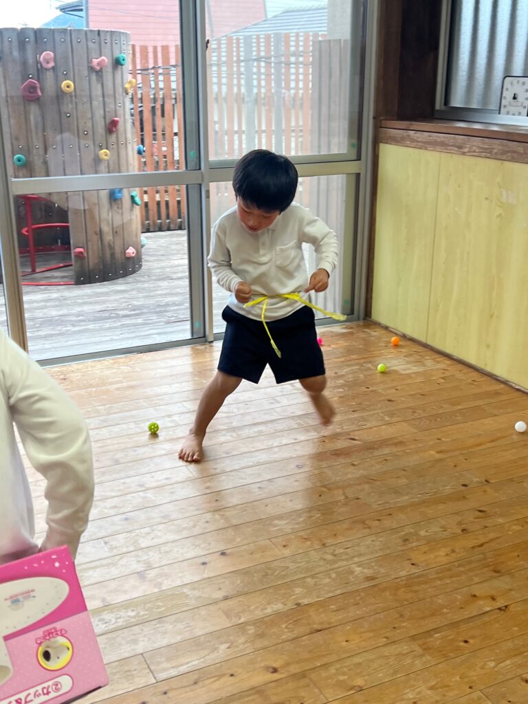 腰に巻き付けた箱の中からボールを出す活動。