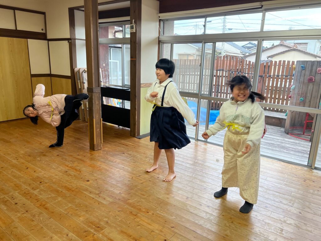 いろいろな動きをしながら、お友達のまねをしながら