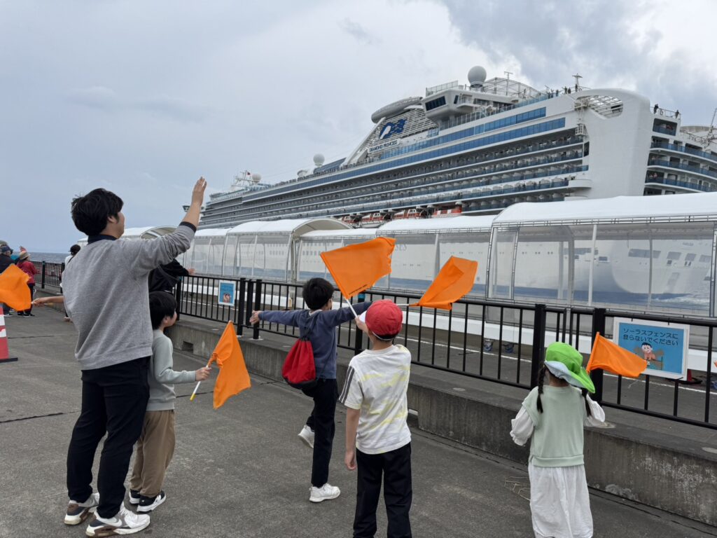 遠くなる船に「また来てね~」と旗を振ってお見送り☆