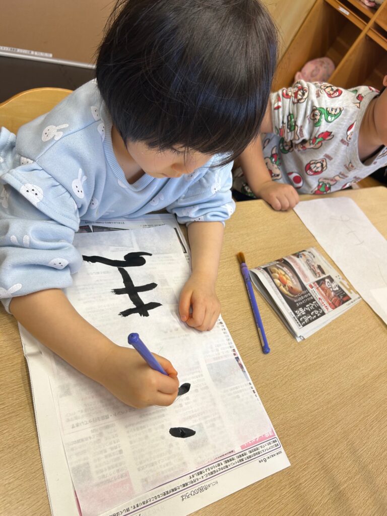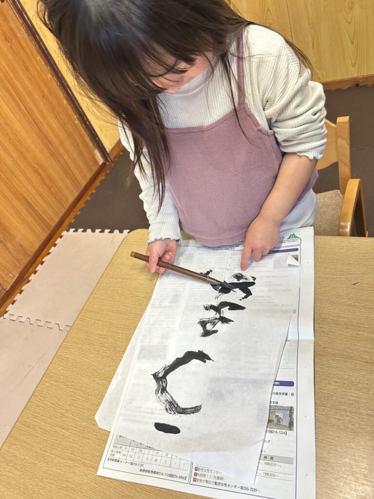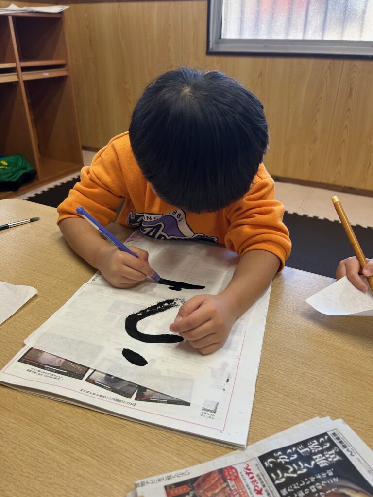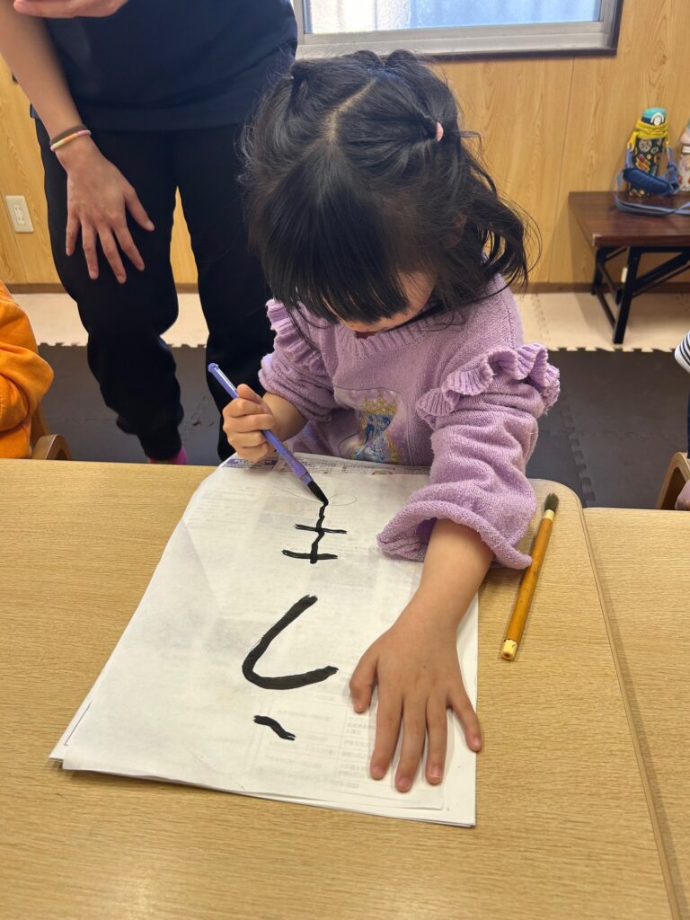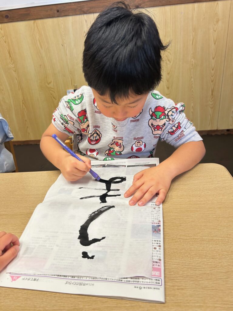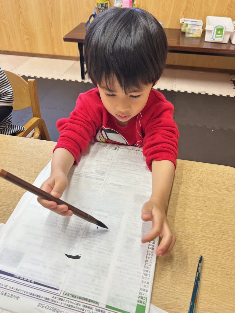 初めての習字に苦戦しながらも興味津々の子供たちでした👀