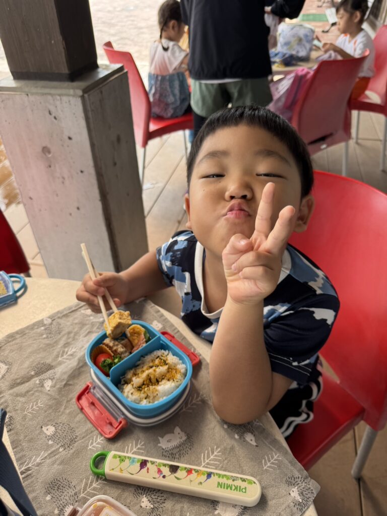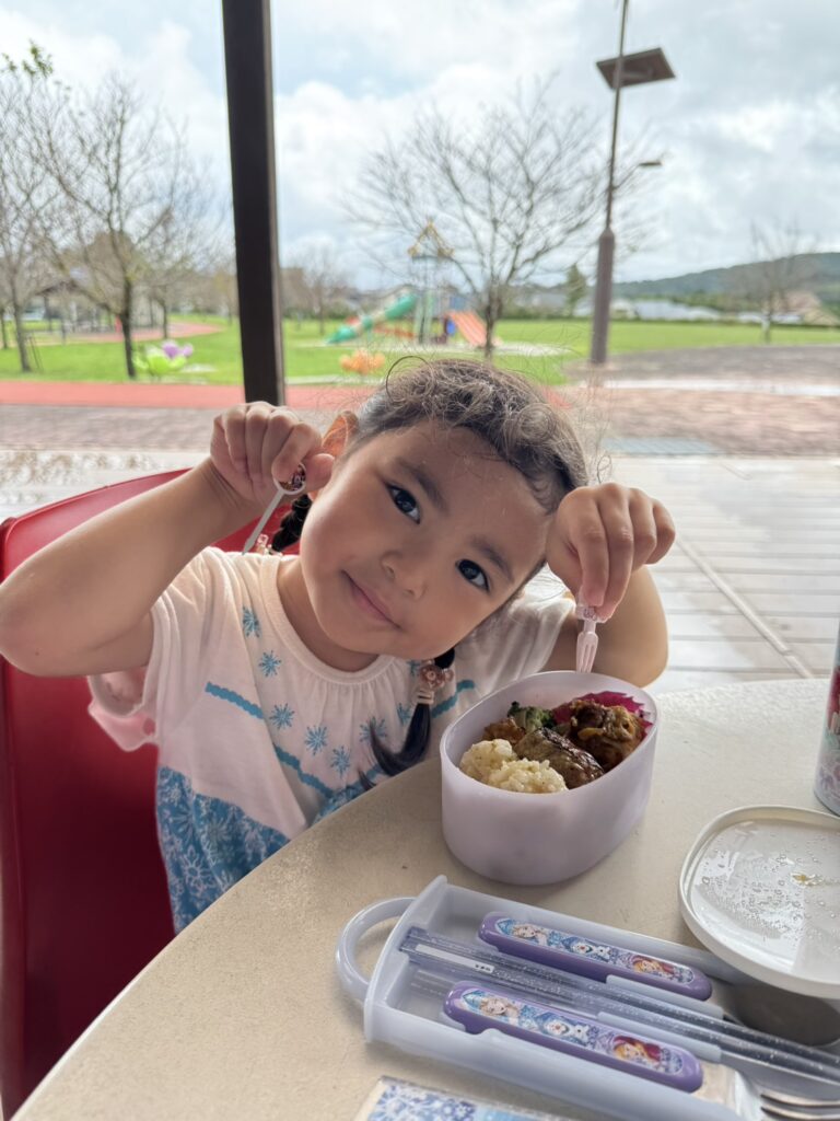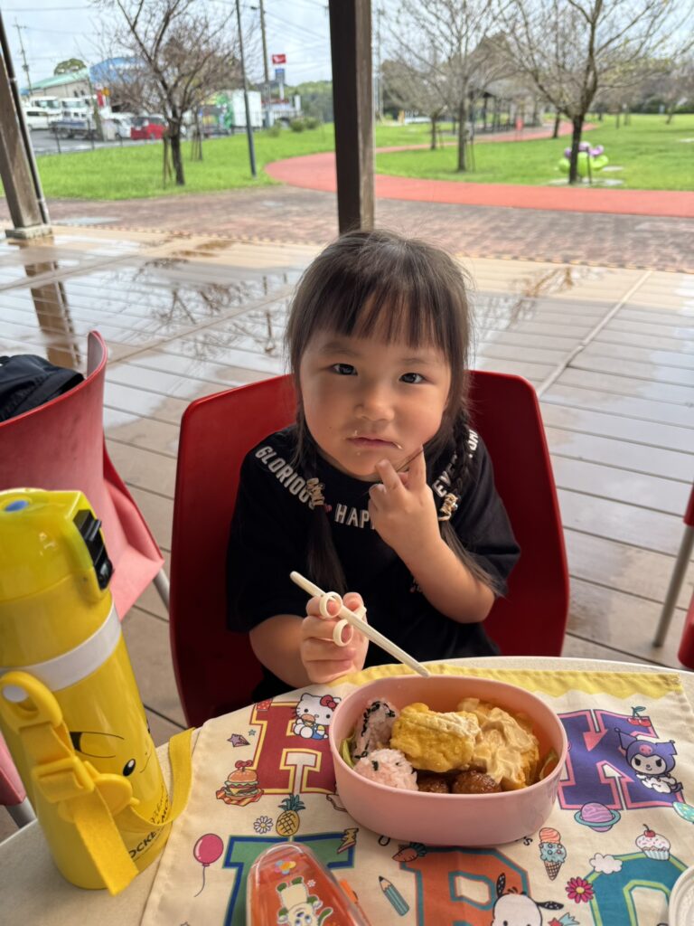 朝から降っていた雨で、遊具が濡れていて遊べなかったのですが、外で食べる愛情たっぷりのお弁当は格別!