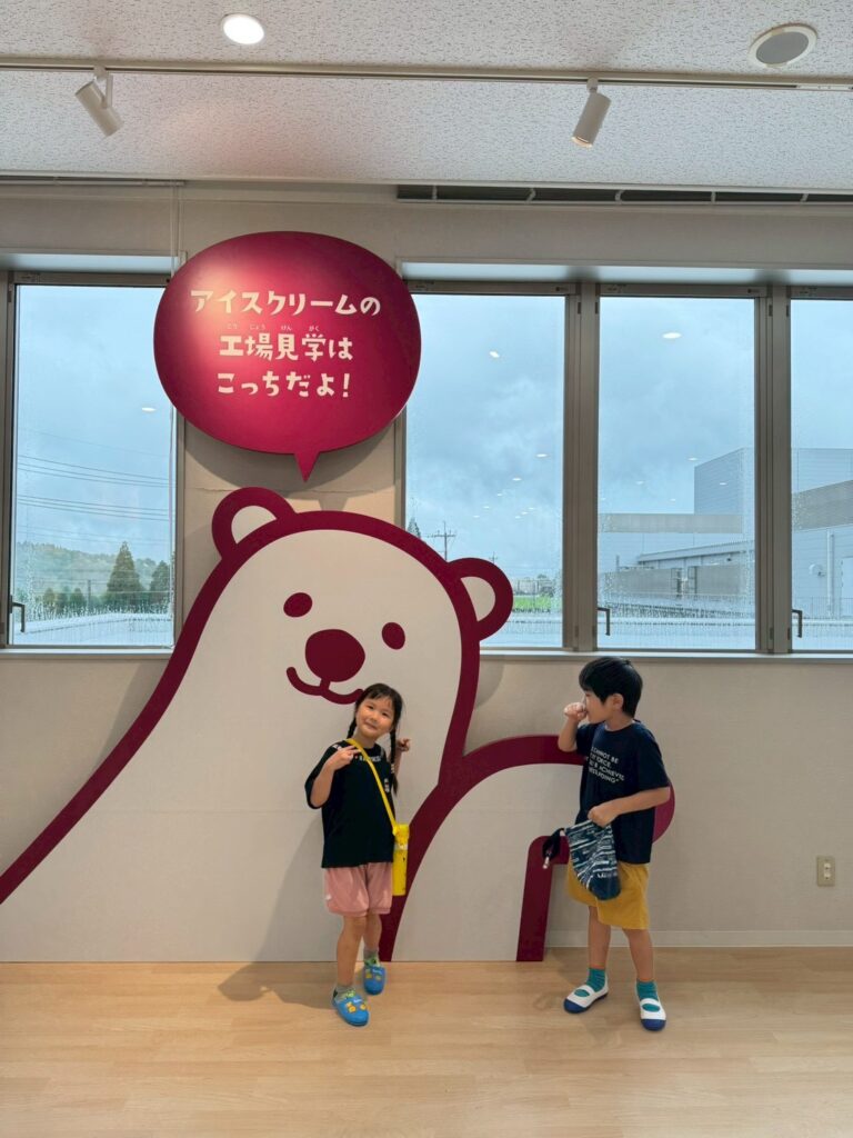 工場が見えると、「わぁ~~~!」と歓声が上がる車内!お出迎えしてくれた白熊さんとパシャリ☆