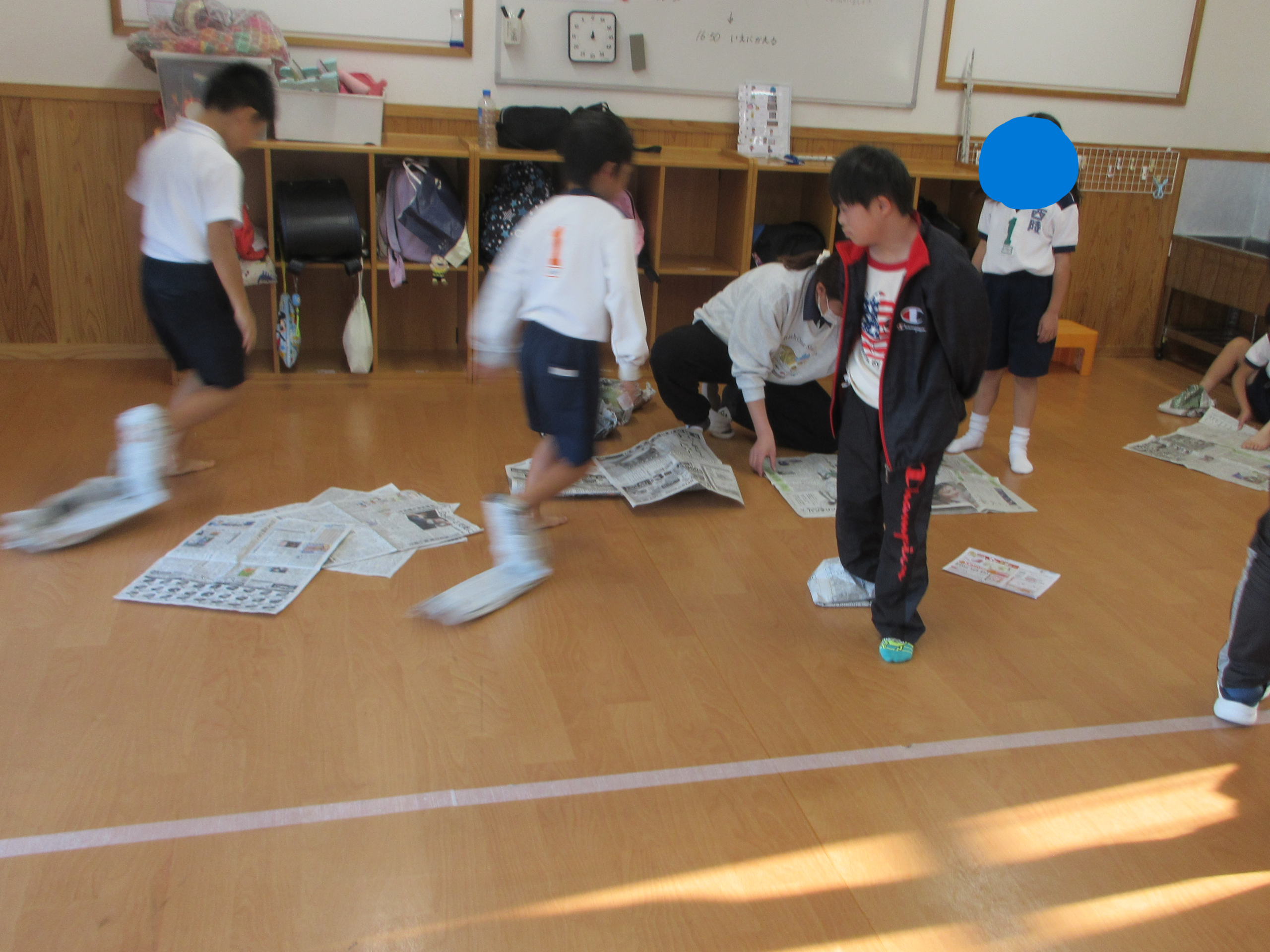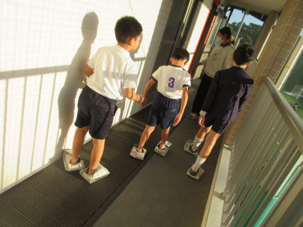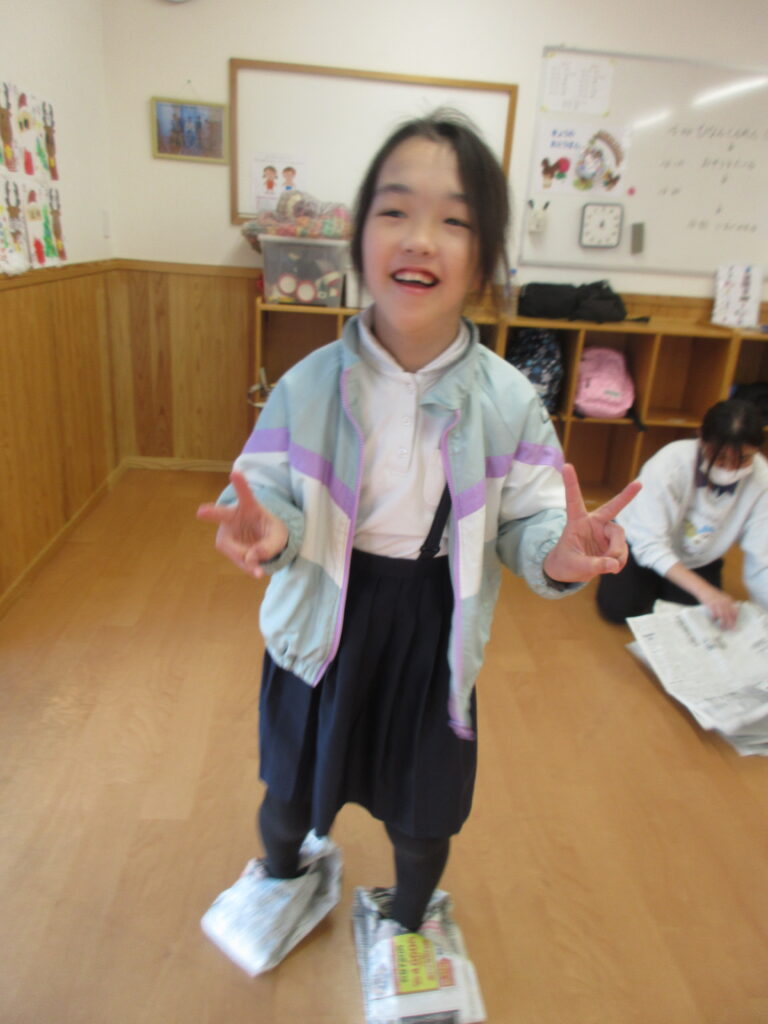 新聞紙スリッパでの移動の難しさも経験できたようです。