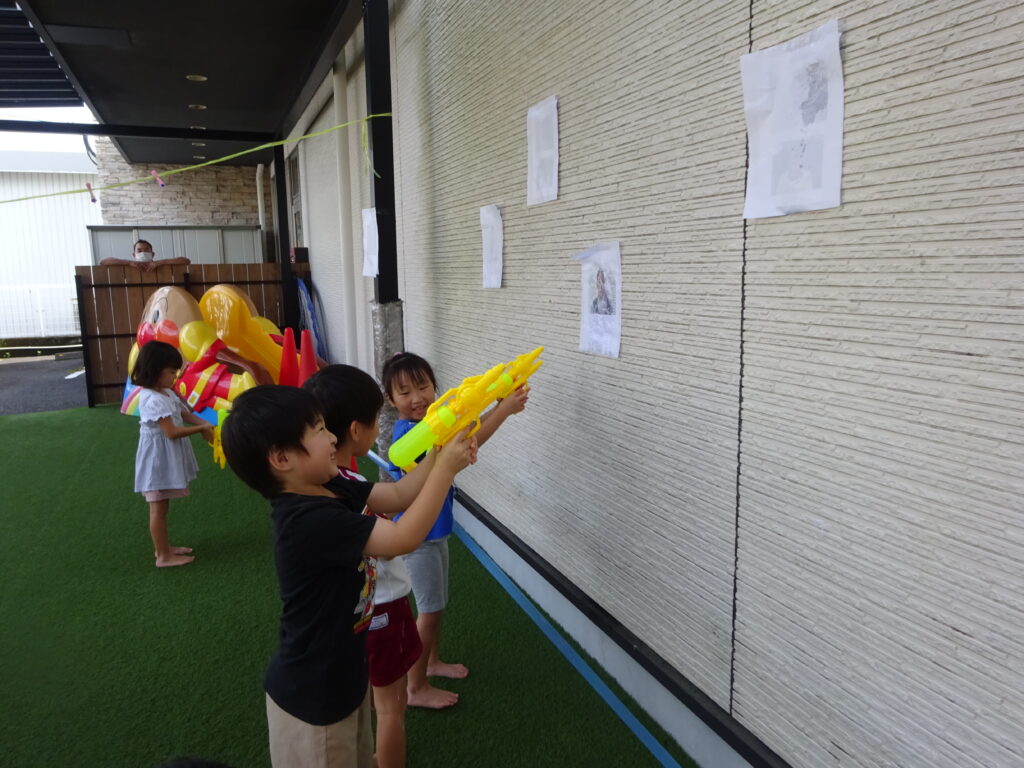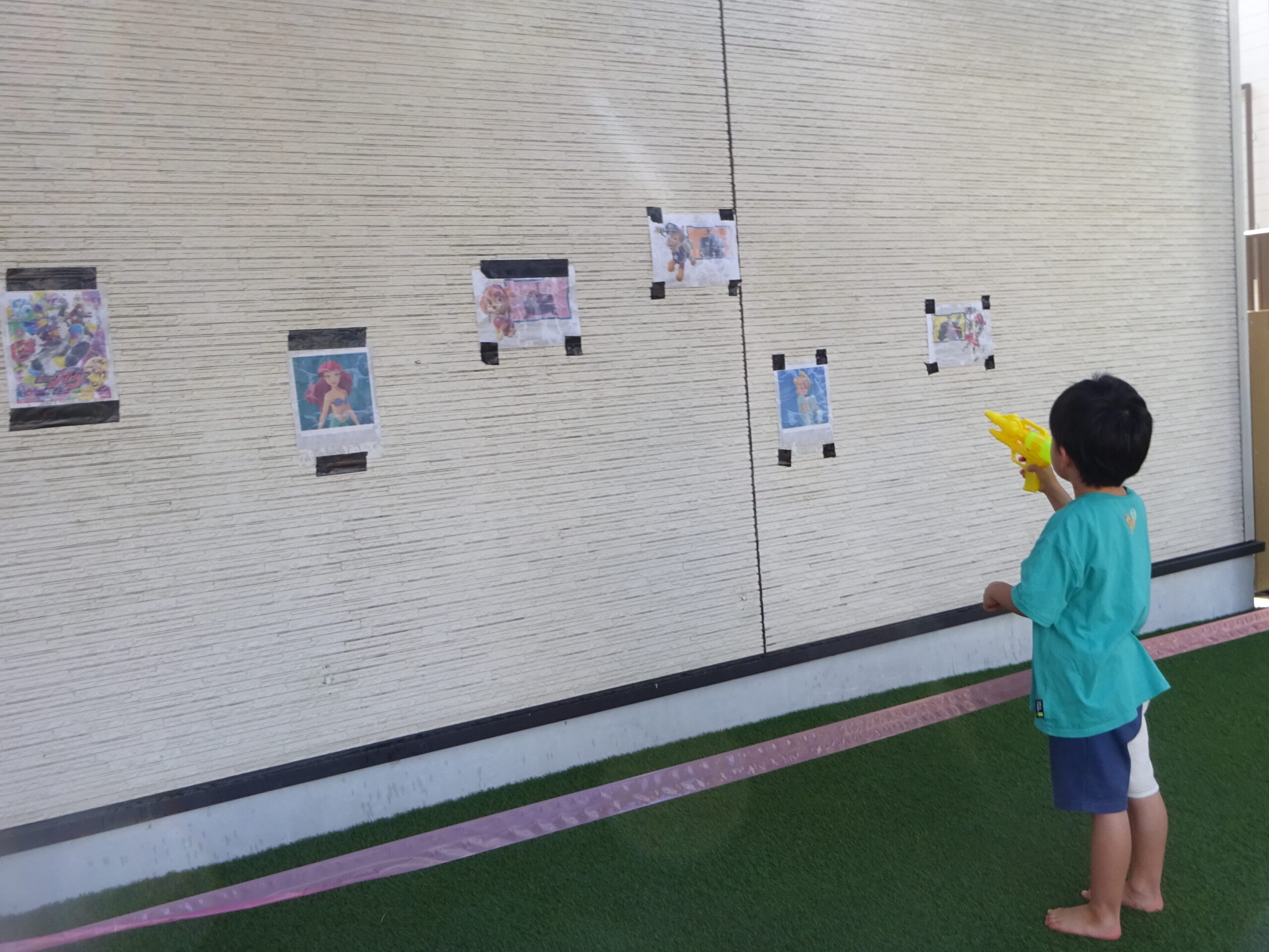 お友だちがかけた水で出てきた絵を見て、他の遊びをしていた子どもたちも「あ!ピカ○ュウ!」、「きょうりゅう!」とかけていました🔫