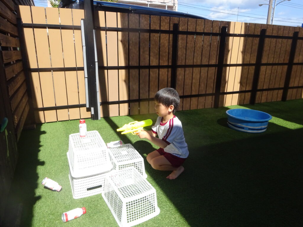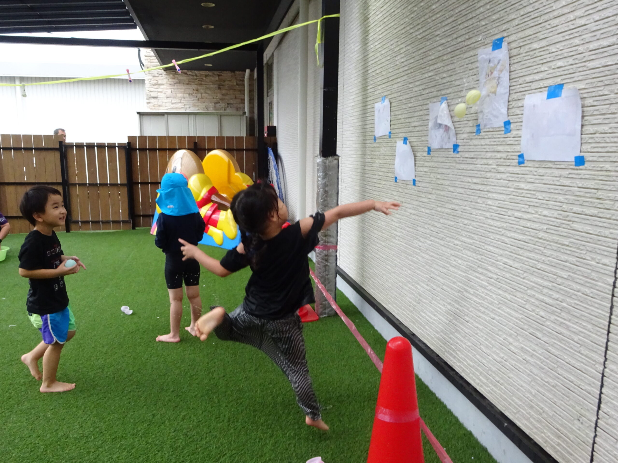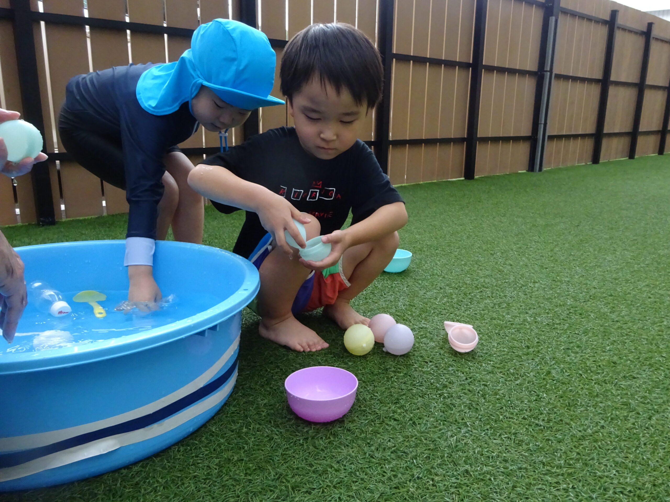 午前利用の子どもたちも何回か試すうちに発見があったようで、容器で片方に水を入れてもう一方で蓋をし、たくさん作って投げていましたよ☺