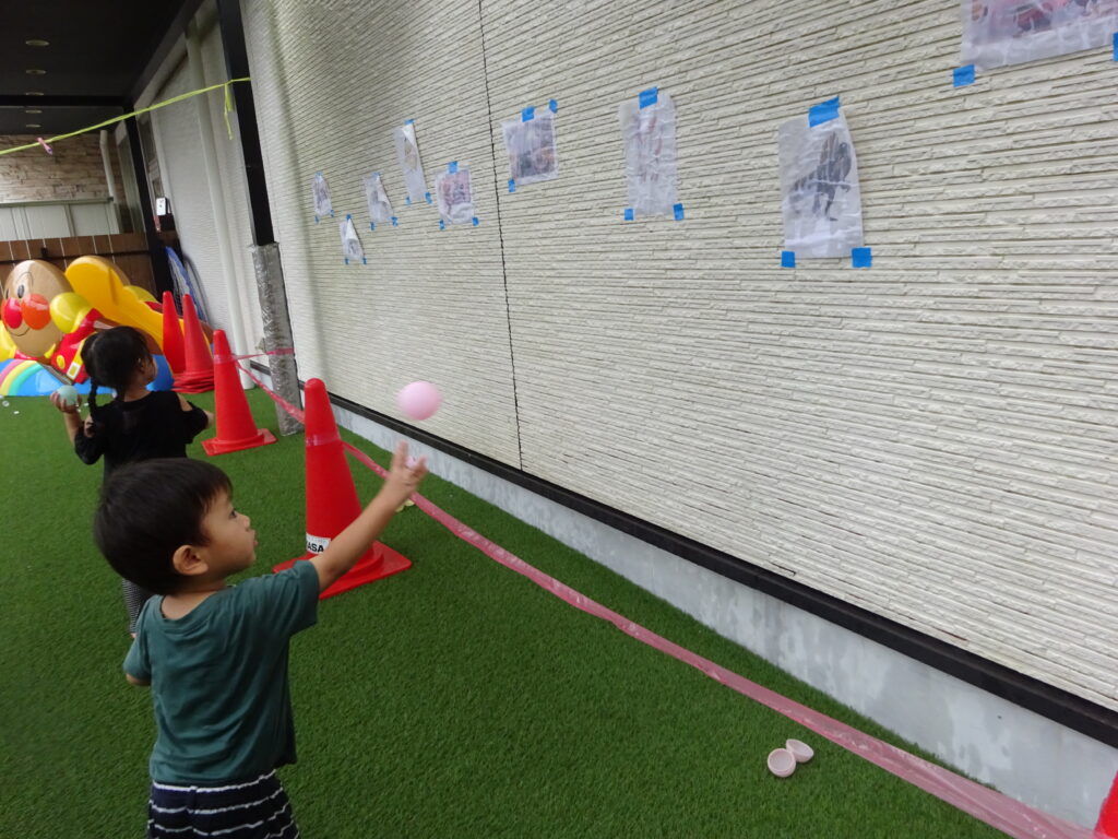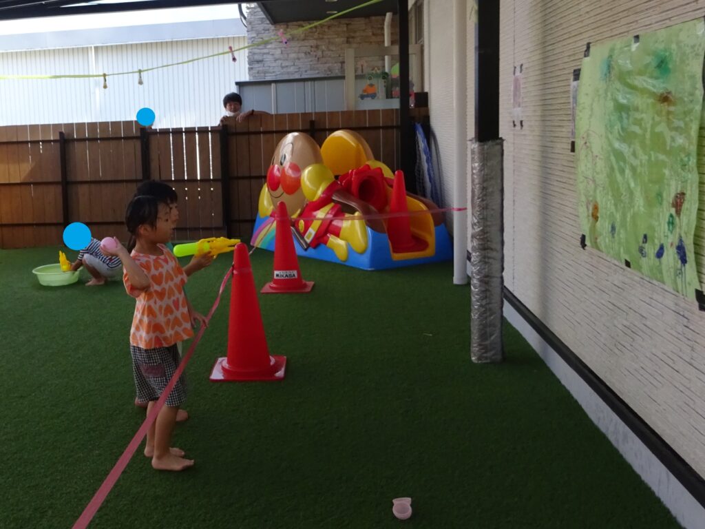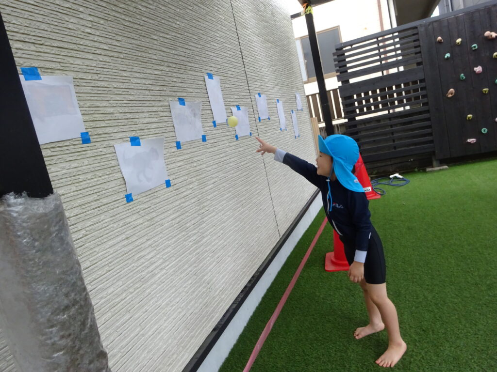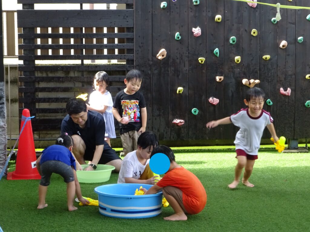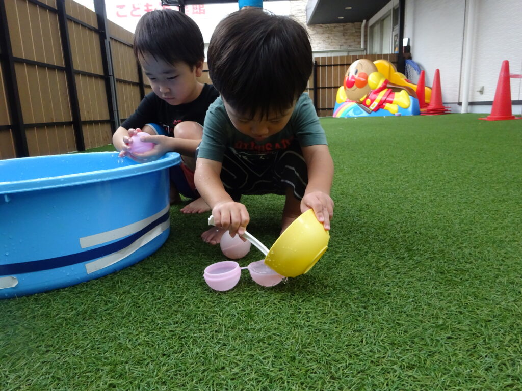 午前利用の子どもたちも何回か試すうちに発見があったようで、容器で片方に水を入れてもう一方で蓋をし、たくさん作って投げていましたよ☺