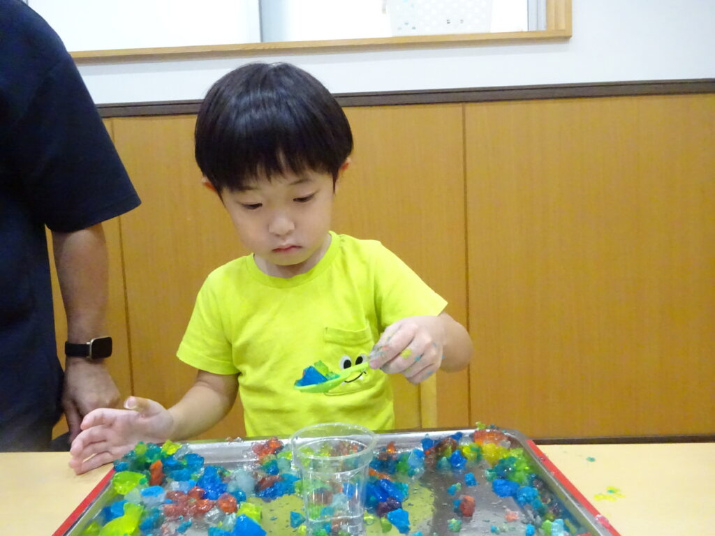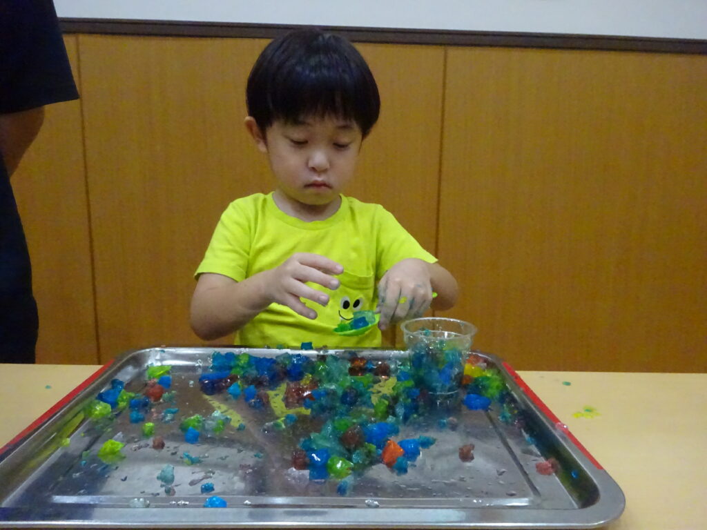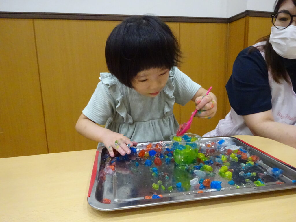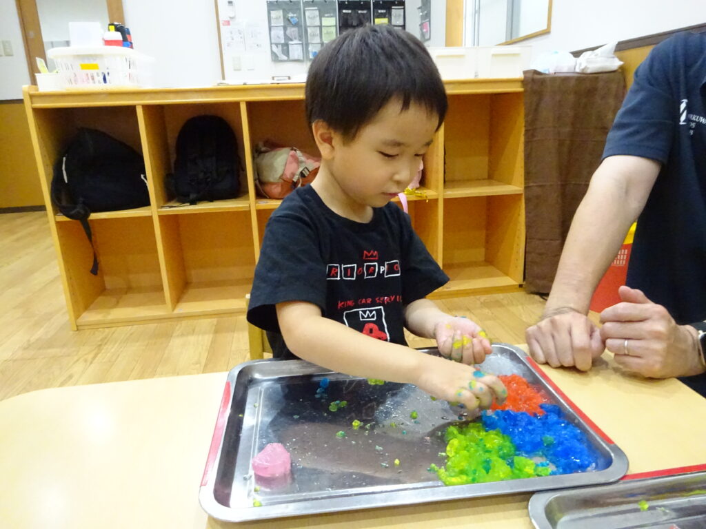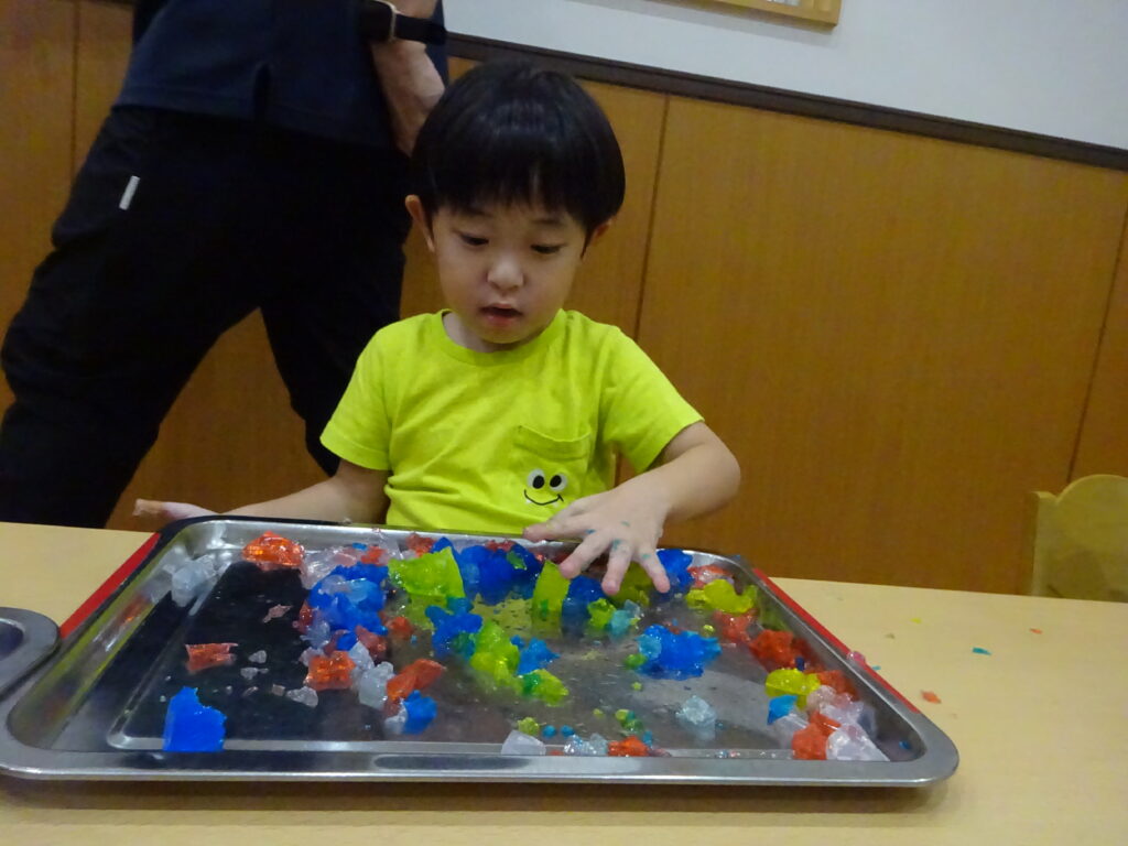 たくさん感触を楽しんだら次々に色々な色の寒天が登場!!