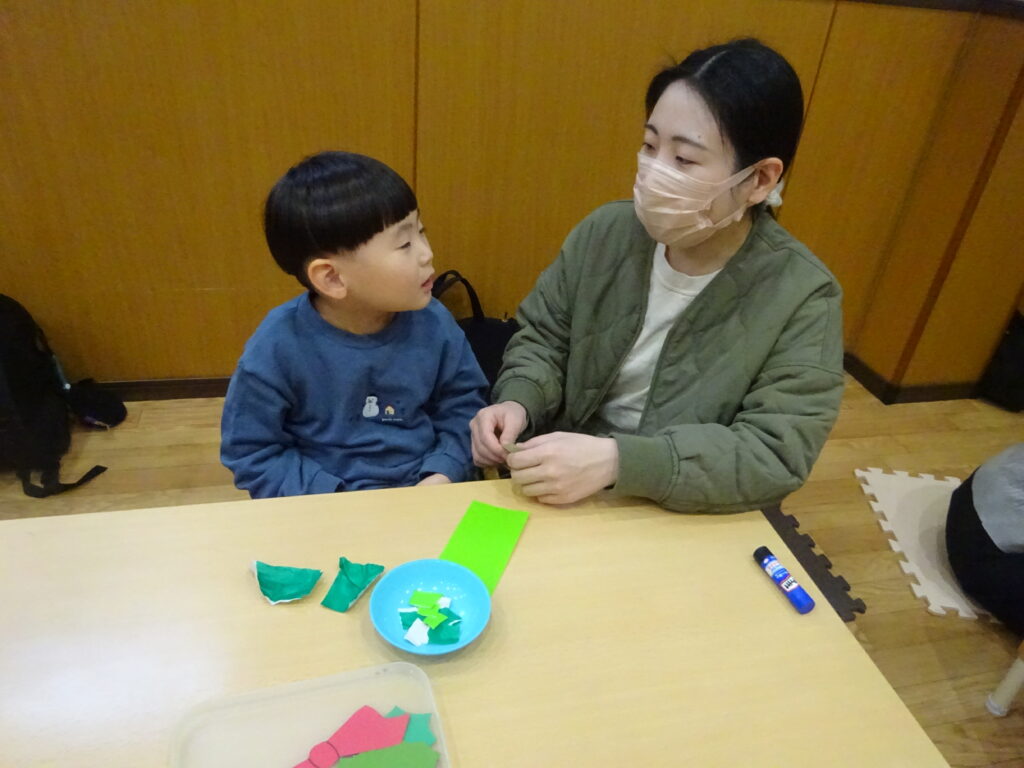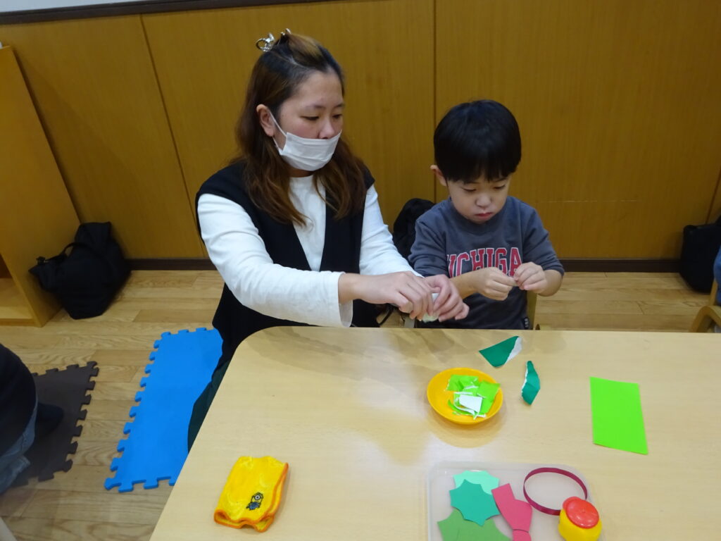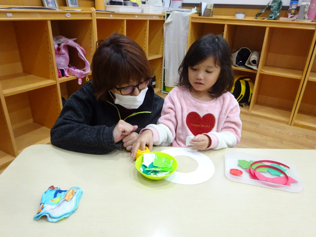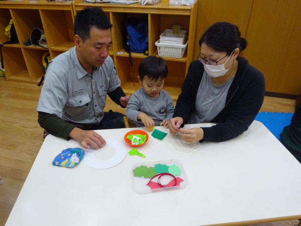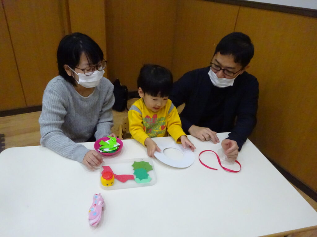 クリスマスリース作りでは、お母さん、お父さんと一緒に折り紙を千切って丸い台紙に貼っていきました。