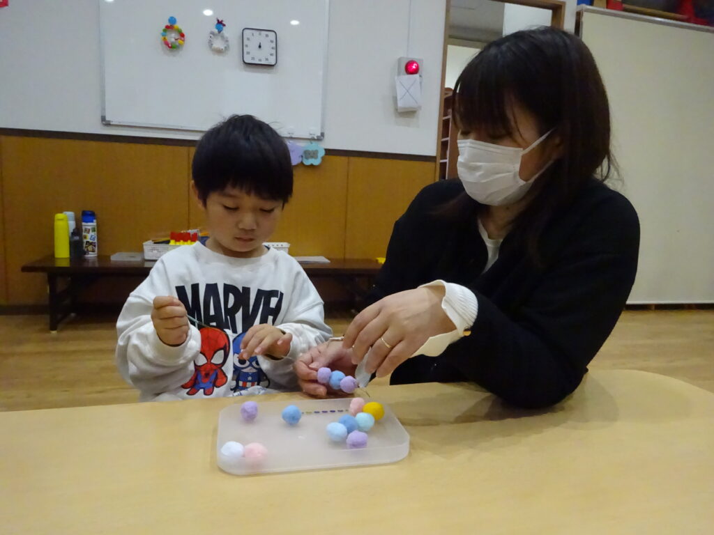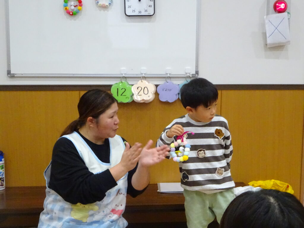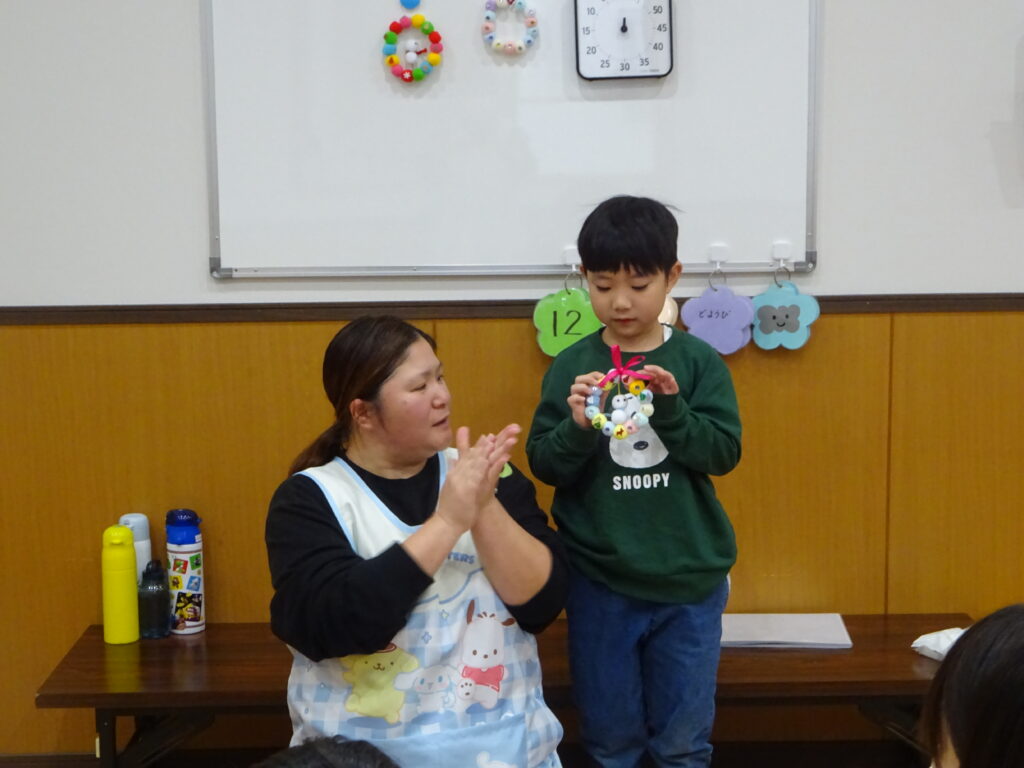 以前は保護者の方と離れがたかった子も、前に出て作ったリースをお披露目することができました!