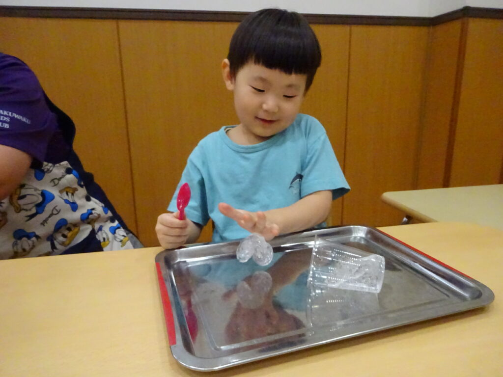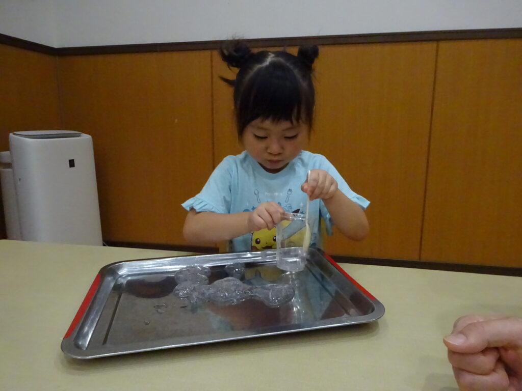 スプーンを使ってスライムを掻き出すとさっそく触って遊び始めていましたよ☺