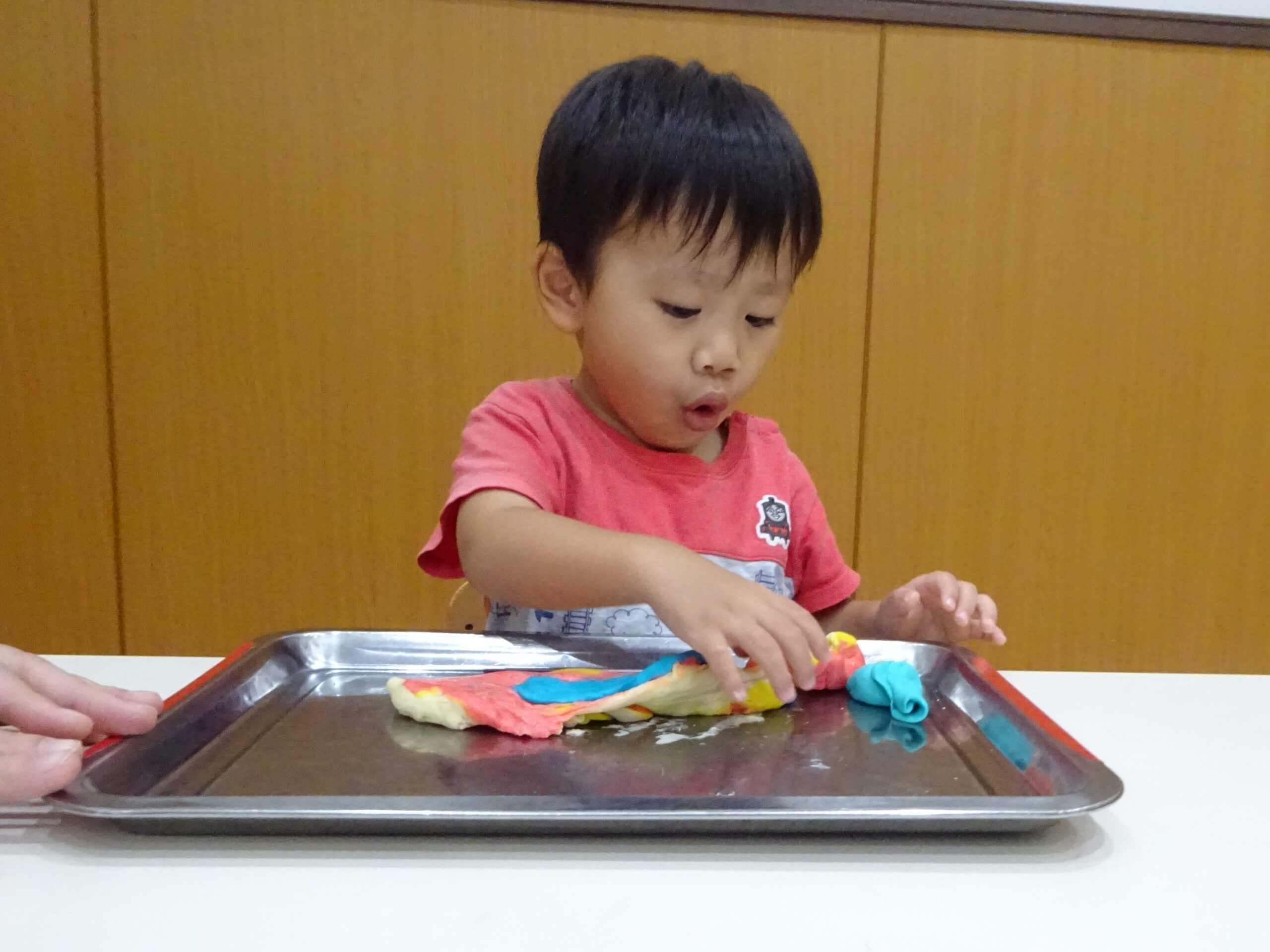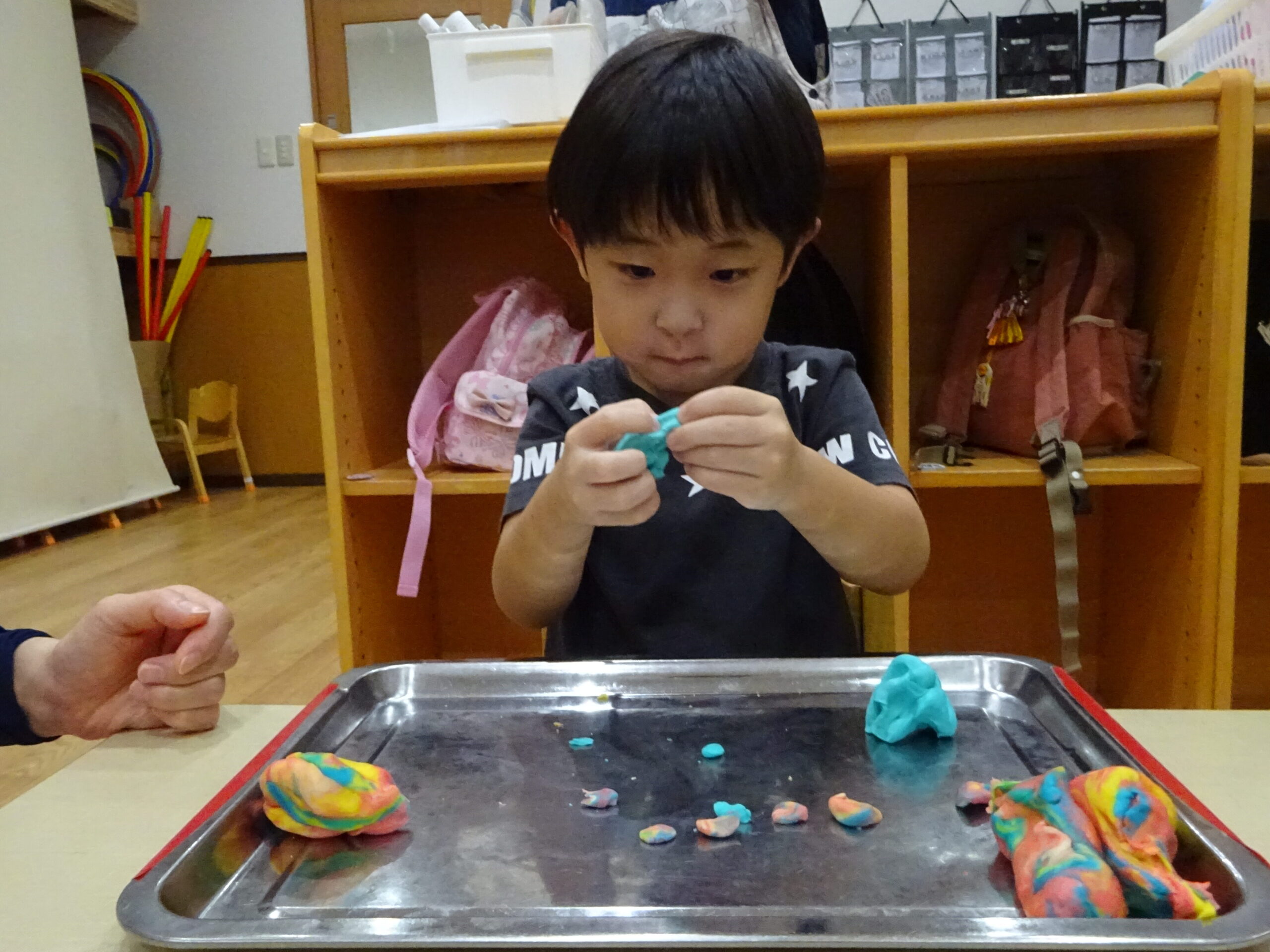 事前に作った小麦粉粘土をみせ、「遊ぶ?」と聞くと「ちょうだい!」と教えてくれました。